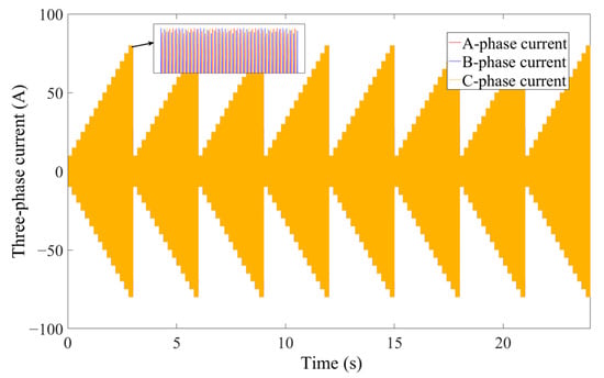 where, and are the predicted currents at k+1 time (A). and are the output voltages of the d and q axes at time k (V). and are the d and q axis currents sampled at time k (A). is the electromechanical angular velocity at time k (rad/s). L is the model inductance of the motor (H). is the model flux linkage of the motor (Wb). R is the model resistance of the motor (). Through the three-phase current output of the wheel hub motor model, a foundation can be laid for the subsequent modeling of unbalanced electromagnetic force. The nominal parameters of the wheel hub motor in this study are shown in Table 1.