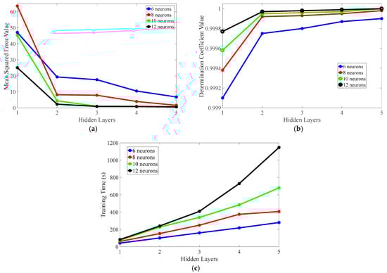 The relationship between the training effect of BP neural network and the number of hidden layers and the number of neurons. (a) The relationship of mean squared error value with the number of hidden layers and the number of neurons. (b) The relationship of determination coefficient value of hidden layers and the number of neurons. (c) The relationship of training time with the number of hidden layers and the number of neurons.