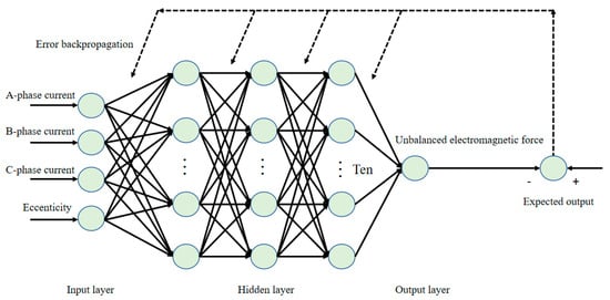 Based on the above analysis, the output characteristics of the vertical unbalanced electromagnetic force have a strong correlation with the three-phase current amplitude and the eccentricity of the fixed rotor. Therefore, in this study, three-phase current and fixed rotor relative eccentricity are used as the characteristic parameters of the input layer of the BP neural network in the Neural Net Fitting toolbox of MATLAB/2016b software to train the neural network, so as to fit the vertical unbalanced electromagnetic force function. Obviously, the output layer of the neural network is the vertical unbalanced electromagnetic force. The main construction steps of the BP neural network structure are as follows: