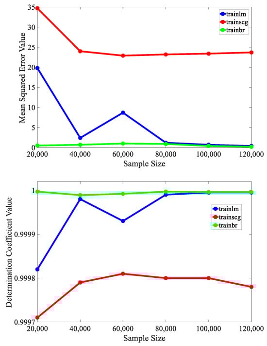 At present, there are mainly three commonly used training functions for BP neural networks: trainlm, trainbr, and trainscg, and their performances are different. In order to select the appropriate training function, simulations under different training functions are carried out. Figure 15 presents the comparison of the training results of each training function under different sample sizes. The mean squared error and coefficient of determination are used to evaluate the prediction accuracy and fitting ability of the model, respectively. It can be seen that for the neural network model trained with the trainlm and trainscg functions, its prediction accuracy improves as the number of samples increases. When the number of samples reaches a certain level, the training effect tends to be stable. The training effect of the neural network trained by the trainbr function is almost unaffected by the number of samples. Moreover, under the same number of samples, the mean squared error value of this neural network model is the smallest, and the determination coefficient value is infinitely close to one. Therefore, the trainbr training function is adopted in this paper.