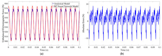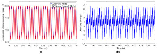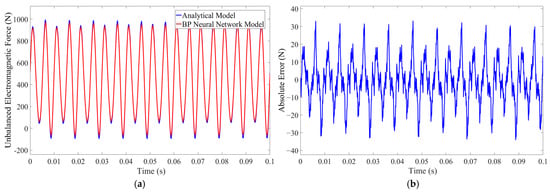 Motor unbalanced electromagnetic force output comparison at 195 rpm, 20 A. (a) The fitting effect of BP neural network. (b) The absolute error of BP neural network model and analytical model.