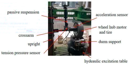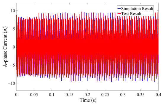 The main structure of the test bench is shown in Figure 19, including the tire, permanent magnet motor, tension pressure sensor, vibration platform, wheel hub motor fixture, current and acceleration sensor, passive suspension, etc. The phase current of the wheel hub motor is collected by a single-channel hydraulic vibration excitation test rig. Due to the obvious vibration of the wheel hub motor near the motor shaft and the low difficulty in arranging the acceleration sensor, a square platform is designed at the connection position between the swing arm and the motor shaft to carry the acceleration sensor to measure the vertical acceleration of the stator. Install the wheel hub motor and the wheel on the drum. The wheel hub motor and wheels are consistent with the specifications of the test prototype vehicle, and the hydraulic excitation platform below is used to simulate road surface excitation. Set the motor speed to 390 rpm, the actuator amplitude of the excitation table to 0.003 m, and the working frequency to 2 Hz. The curve comparison between experimental results and simulation results under the same simulation conditions is shown in Figure 20 and Figure 21.