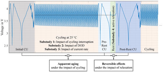 A shortened pre-rest CU is performed right after the last cycle to directly assess the cell behavior after cycling. The influences of the idle period and the associated relaxation processes after cycling are captured by the post-rest CU. Figure 1 visualizes the general testing scheme and organizes the four experimental substudies presented in this work.