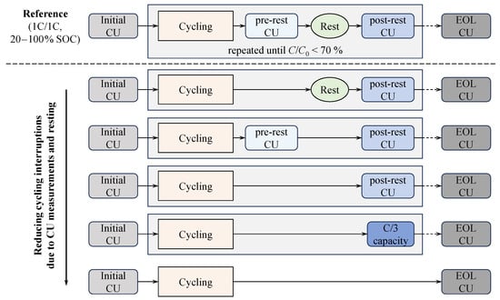Substudy 1 focuses on the inhomogenization behavior due to continuous cycling impacted by intermediate cycling interruptions due to CUs and rest phases. For this purpose, the reference test procedure is reduced stepwise by individual measurement and/or resting sequences, as illustrated in Figure 2. The reference case follows the general testing scheme depicted in Figure 1, including cycling, pre-rest CU, rest, and post-rest CU. Cycling is performed at 1C/1C in the 20 to 100% SOC range.