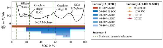 Test design of Substudies 2, 3, and 4 in relation to the cell DV and the characteristic lithiation stages of the positive and negative electrodes: In Substudy 2, the SOC range is varied, and the current rates remain fixed at 1C/1C, while in Substudy 3, the SOC range is kept constant at 0 to 100%, and the current rates are modulated. Substudy 4 comprises three static relaxation test cases with idle phases at the SOC levels indicated by the green dashed lines, as well as one dynamic test case that includes a low-current charge cycle from 0 to 100% SOC. This figure has been adapted from our earlier publication [34].