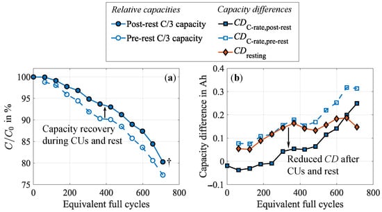 Formation of reversible capacity losses during cycling: relative capacity measured before and after the ten-hour rest (a), capacity differences regained during CUs and rest (b). The cell failed only a few cycles after the last CU point presented, indicated by the † symbol. This figure has been adapted from our earlier publication [34].