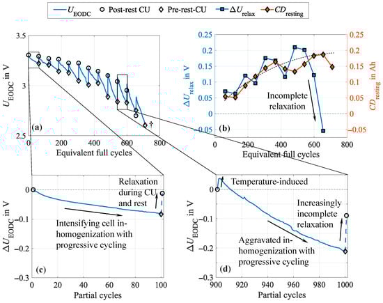 Alterations in the end of discharge voltage throughout the cycle aging test: Shift in during cycling, CU, and rest; the † symbol indicates failure of this cell, which occurred a few cycles after the last CU point shown (a). during two specific cycle intervals, normalized to the respective initial value of each interval, at an early aging state from cycle 1 to 100 (c) and an advanced aging state from cycle 901 to 1000 (d). Correlation between end of discharge voltage relaxation and capacity recovery during CU and rest (b). This figure has been adapted from our earlier publication [34].