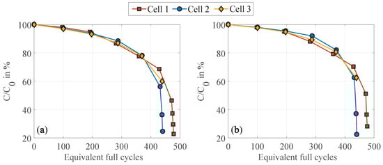 Figure A1 illustrates the correlation between end of discharge voltage and cell temperature, exemplarily shown for the cell in test case 20–100% DOD within the cycle interval between 900 and 1000 cycles. The observed behavior is consistent across other cycle intervals and between different cells. As evident from the plot, the cell temperature increases during the first few cycles after approaching the ambient temperature of 25 °C in the climate chamber during CU and resting. This temperature rise is accompanied by an increase in end-of-discharge voltage, as cell polarization decreases.