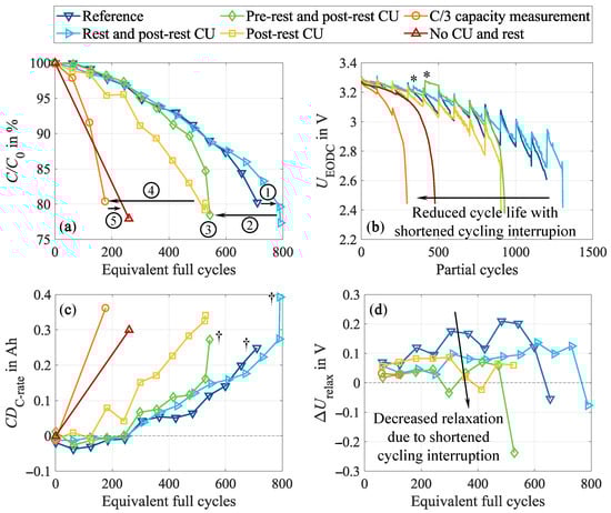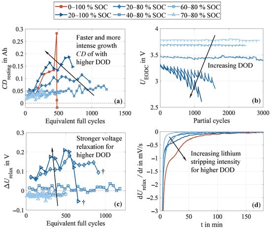 In good agreement with these results, the impact on is enhanced by increasing DODs, revealing the same trend and consequently indicating stronger cell inhomogenization when applying larger cycle depths [34]. This becomes evident in Figure 9b,c, showing the progressions of the end of discharge voltages as well as the voltage relaxations during CU and rest. As observed earlier, the intensity of inhomogenization, as well as incomplete relaxation during rest, amplifies with progressive cycling, suggesting a self-reinforcing behavior [14]. In this regard, it should be recapitulated that the number of cycle repetitions between two subsequent CUs is the same for all test cases. Thus, cells with a larger DOD experience higher charge throughput during cycling between two subsequent CUs than cells with a lower DOD. This higher charge throughput causes even stronger inhomogenization during cycling, supporting the self-reinforcing behavior. In addition, a lower CU frequency related to the charge throughput allows for less frequent cell relaxation and thus rehomogenization, limiting the comparability of the observed magnitudes of inhomogenization between the different DOD test cases.