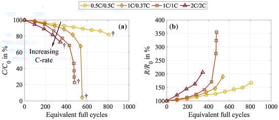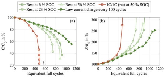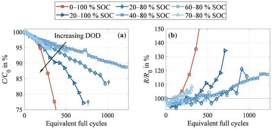 Measurable cell deterioration depending on the applied DOD in terms of capacity loss; the † symbol indicates cell failure, which occurred a few cycles after the last presented CU point (a) and resistance increase (b). This figure has been adapted from our earlier publication [34].