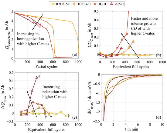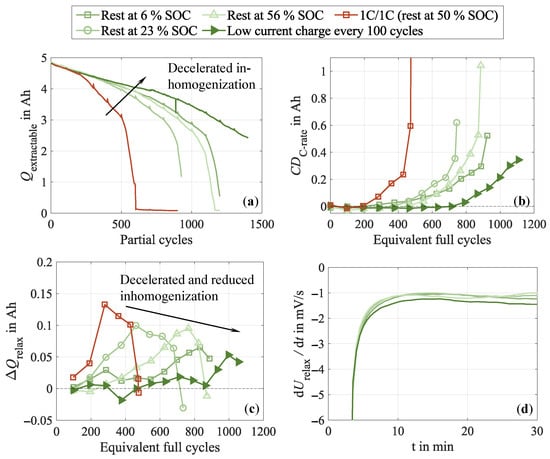 Since measurement impacts can be precluded, these differences must result from effects occurring during the rest phase and the CUs. After cycling, the cell exhibits inhomogeneities in terms of lithiation and conducting salt distribution mentioned above to a certain degree. As a consequence, shares of the active lithium are inaccessible. During the rest phase and the CUs, which are characterized by predominantly low current charge and discharge sequences as well as several additional rest phases, these inhomogeneities can partly equalize, leading to a redistribution of lithium within the negative electrode and increasing the lithium accessibility. Therefore, the capacity increases. An inverse correlation with the () is evident, revealing a reduced capacity difference after relaxation. Moreover, both capacity differences, and , exhibit a high similarity, supporting the explanation given by Lewerenz et al. [21]. They emphasize that the capacity difference mainly results from inhomogeneous lithium distribution, which strongly limits the extractable capacity. Due to the different time scales during discharging at low and high current rates, these inhomogeneities equalize to varying degrees, explaining the capacity difference. While increased overpotentials due to increased internal resistance also reduce the extractable capacity as the cut-off voltage is reached earlier depending on the C-rate, this impact is minor since the voltage curves are very steep at the end of discharge. The impacts of the negative electrode’s overhang during the rest phase are assumed to be negligible since the rest SOC matches the average SOC during cycling. Hence, no considerable lithiation differences should occur between the active and passive areas of the negative electrode, which is in agreement with findings from the literature [15,17,38].
