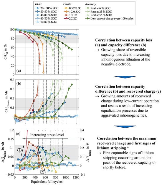Firstly, a high correlation between the capacity loss and the increasing capacity difference is evident from Figure 14a,b. The capacity difference results from inhomogeneous electrode lithiation and represents a reversible loss of lithium. Consequently, this correlation indicates the strong superimposition of reversible losses and the measured capacity fade. A growing share of reversible losses becomes evident, especially towards the end of the tests, where the capacity difference significantly increases. This implies aggravating inhomogenization of the negative electrode and is in line with the literature, where increasing inhomogeneity with progressive cycling has been reported [9,21].