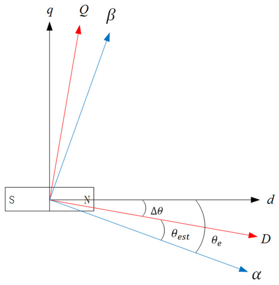 The sensorless control of a PMSM is often achieved by using the high-frequency pulsed signal injection method at low speed, which is based on injecting a high-frequency sinusoidal signal into the direct axis in the estimated rotor rotational coordinate system, thus extracting a high-frequency pulsating current response signal containing rotor information and obtaining rotor position and speed information. Figure 1 shows a block diagram of the high-frequency pulsed signal injection method for a PMSM sensorless control system. Figure 2 shows the definitions of angles and axes, which involve the stationary coordinate system , the rotating coordinate system , and the estimated rotating coordinate system . is the actual rotor position angle and is the estimated rotor position angle, and the difference between them is the estimated rotor position error angle .