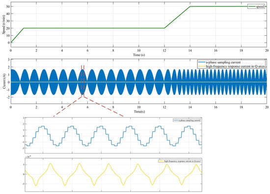 Simulation results of the sampling three-phase current and the high-frequency response current at 0–20–50 r/min.