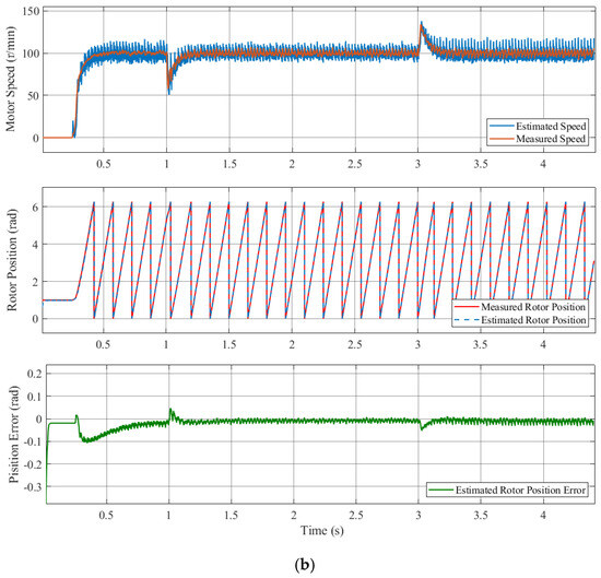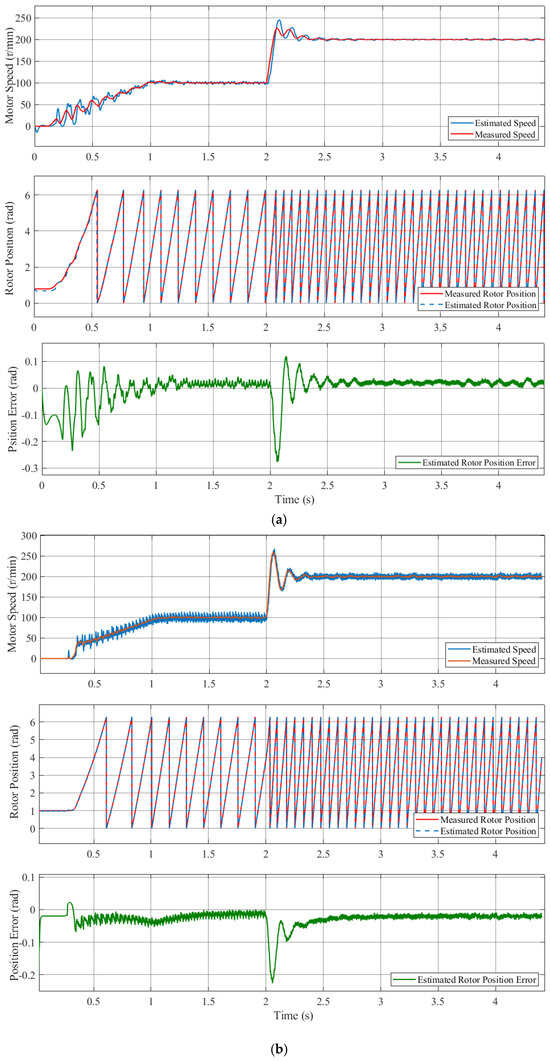 Figure 8 shows the rotor position and estimated position error waveforms for the conventional high-frequency pulsed signal injection method and the proposed compensation strategy when the motor speed was step-increased from 0 r/min to 100 r/min to 200 r/min. The variation curve of the estimated motor speed in these figures demonstrates that the motor speed remains stable after a slight overshoot for both methods of operation. As the speed undergoes variation, the estimated error demonstrates a relatively major change, but when the speed is stable, the estimated error is small. As demonstrated in Figure 8a, the maximum estimated rotor position error in the conventional method was 0.28 rad, and the steady-state estimated rotor position error was approximately 0.03 rad. As illustrated in Figure 8b, the maximum estimated rotor position error in the conventional method was 0.22 rad, and the steady-state estimated rotor position error was approximately 0.02 rad. It can be seen that the amplitude of the estimated rotor position error signal after the compensation is smaller, which means the estimated rotor position is closer to the measured rotor position. The comparison further demonstrates that the estimated speed is smoother at the higher motor speed, which indicates the superiority of compensation. The simulation results verify that the compensation strategy can effectively eliminate the estimated rotor position error; consequently, a more precise measurement of the rotor position is obtained.