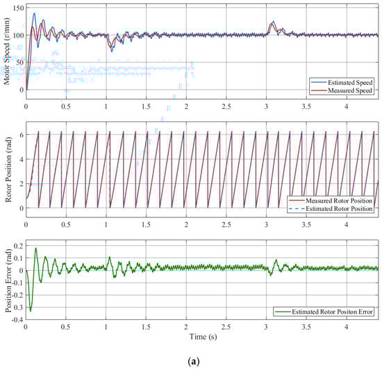 Figure 9 shows the rotor position and estimated position error waveforms for the conventional high-frequency pulsed signal injection method and the proposed compensation strategy under the load variation operation condition for a motor speed of 100 r/min, with loading of 2 Nm at 1 s and unloading at 3 s. The variation curve of the estimated motor speed in these figures demonstrates that the motor speed fluctuated during loading and unloading. As illustrated in Figure 9a, the maximum estimated rotor position error was 0.11 rad in the conventional high-frequency pulsed signal injection method, and as illustrated in Figure 9b, the maximum estimated rotor position error was 0.05 rad with the proposed compensation strategy. In contrast, the estimated position error at unloading is comparatively diminished. The motor started with a slight overshoot and then stabilized at the given speed. The estimated position and motor speed are shown to converge stably during the operation process, thus demonstrating that the proposed method exhibits satisfactory dynamic performance under the load variation operation conditions.