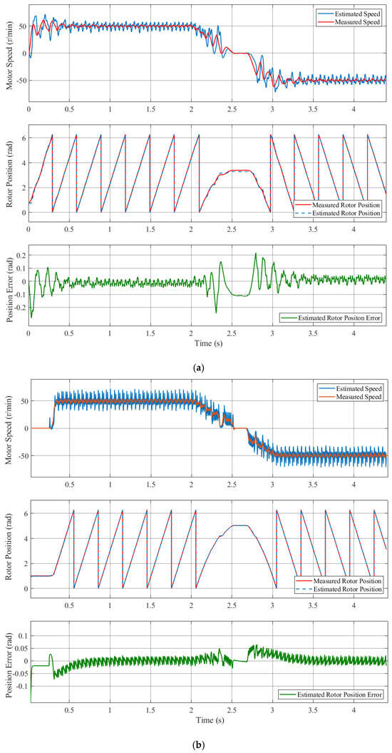 Simulated results of the motor under the forward and reverse rotation operation conditions: from 50 r/min to −50 r/min. (a) The conventional high-frequency pulsed signal injection method; (b) the proposed compensation strategy.
