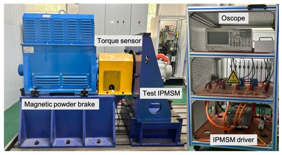 The proposed sensorless control system using the error compensation strategy was verified on a platform, as shown in Figure 11. The parameters of the IPMSM selected were the same as those in the simulation analysis. The load was a hysteresis dynamometer, which could provide torque from 0 to 5 Nm. The system used a photoelectric encoder to detect the actual rotor position, which was used in a comparison with the observed value of the position information. The PWM carrier frequency was 10 kHz, the current sampling frequency was 10 kHz, the frequency of the injection voltage signal was 1 kHz, and the amplitude was 20 V.