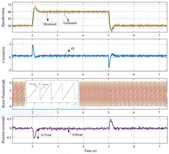 Figure 12 shows the controlled performance of the IPMSM at varied speeds of 30–60–30 r/min using the compensation strategy. The waveforms include the motor speed, current, estimated rotor position, and error comparing the sensor and the sensorless control systems. It is evident that the operation of the motor was relatively smooth. When the rotational speed changed, the instantaneous estimated rotor position error was approximately 0.51 rad, and when the rotational speed was stable, the average steady-state estimated rotor position error was about 0.09 rad. The experimental results demonstrate that the IPMSM exhibited satisfactory dynamic performance when utilizing the compensation strategy proposed in this paper under conditions of speed variation.