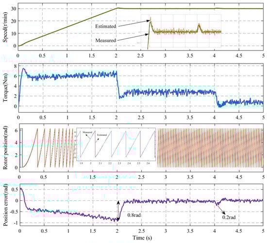 Figure 14 shows the waveforms of the rotational speed and estimated rotor position when the motor speed changed from 30 r/min to −30 r/min, comparing the sensor and the sensorless control systems. When the motor rotated from forward to reverse, the maximum estimated position error was 0.27 rad. It is demonstrated that the estimated rotor position angle exhibited a high degree of correlation with the actual angle when crossing the zero-speed point. Furthermore, the motor speed demonstrated a capacity to rapidly track the actual motor speed. The process facilitated the seamless execution of the switching operation between forward and reverse rotating conditions.