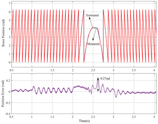 Figure 10 shows the rotor position and estimated position error waveforms for the conventional high-frequency pulsed signal injection method and the proposed compensation strategy under the forward and reverse rotation operation conditions. From the forward rotation to reverse rotation, the estimated speed and estimated rotor position were determined. As illustrated in Figure 10a, for the conventional method, the maximum estimated position error was 0.21 rad when passing through 0 r/min, and the average estimated position error was 0.04 rad under the forward and reverse rotation conditions. As illustrated in Figure 10b, for the proposed method, the maximum estimated position error was 0.06 rad when passing through 0 r/min, and the average estimated position error was 0.025 rad under the forward and reverse rotation conditions.