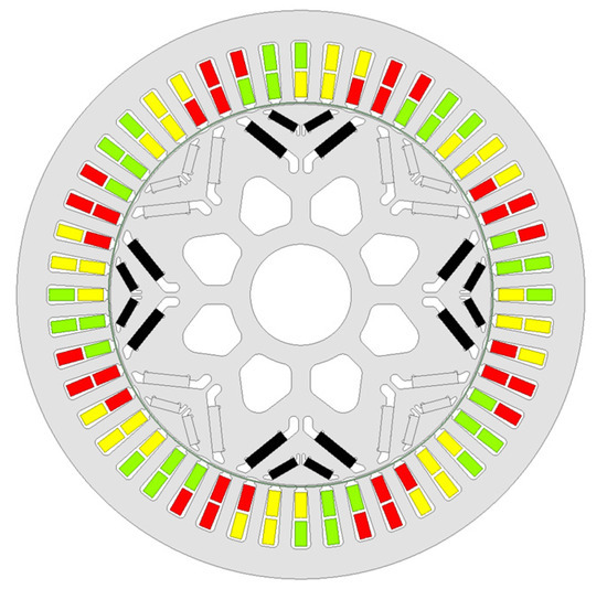 To analyze the vibration characteristics of the integer-slot motor, a dual-V-type 8-pole 48-slot IPMSM designed for electric vehicles is developed. The motor rotor adopts a dual-V-type permanent magnet layout, and a reasonable structural topology is implemented to optimize the magnetic circuit. The two-dimensional structure of the motor is shown in Figure 1. Some important parameters of the motor are shown in Table 1. (In Figure 1, the black part is the positive pole of the magnet, the red part is the A-phase winding, the yellow part is the C-phase winding, and the green part is the B-phase winding).