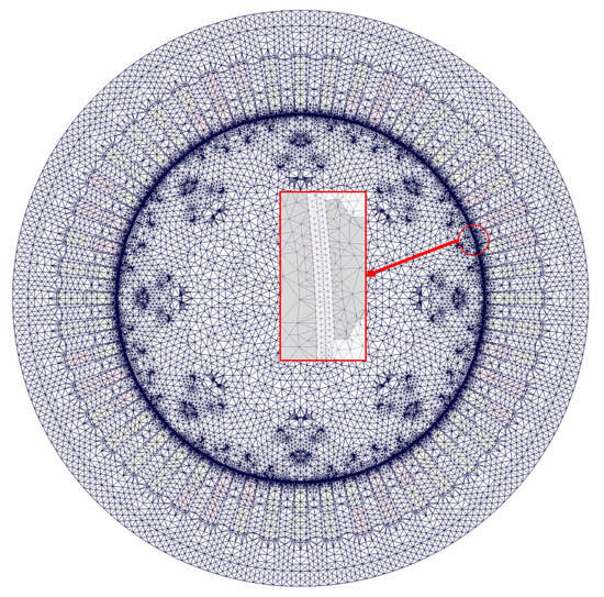 To ensure accurate simulation of motor performance parameters, appropriate mesh sizing and solver settings were implemented in ANSYS 2022 R1. The simulation domain employs a 3.5 mm inside mesh for both the motor body and zero-flux boundaries. Considering the critical importance of airgap region for electromagnetic performance evaluation, a refined onside mesh with 0.25 mm element size was specifically applied to the airgap to enhance solution accuracy, as depicted in Figure 2.