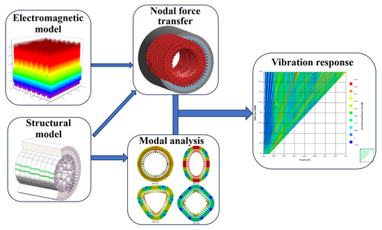 The multi-physical field vibration and noise simulation process of the motor is shown in Figure 3. The finite element method (FEM) is used to calculate the radial force of the motor and the structural modes of the stator housing. Then, the modal superposition method is employed to estimate the harmonic response of the motor [16].