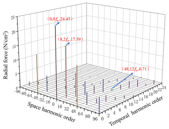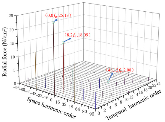 In traditional analysis, the amplitude of low-order radial forces is large and significantly contributes to the vibration of the IPMSM. As shown in Figure 4, except for (where is the supply frequency), the amplitude of the 8th-order radial force is the largest. Therefore, it can be inferred that the 8th-order radial force will excite the dominant vibration of the motor.