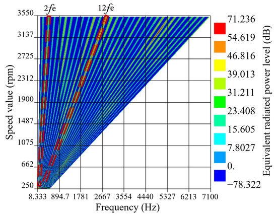However, the multi-speed vibration results of the motor under load, simulated using ANSYS software (as shown in Figure 5), indicate that the equivalent radiated sound power level is highest at . Although the amplitude of the radial force at the 48th-order is much smaller than that at the 8th-order , the radial force at this frequency range has a significant impact on the vibration.