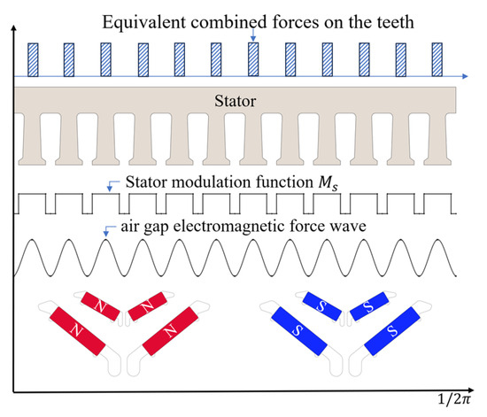 According to the magnetic field modulation effect, each component of the IPMSM must be defined during the modulation process [17]. First, the internal permanent magnets and armature windings are considered as the excitation source of the magnetomotive force (MMF). Then, the slotted stator and the convex rotor are treated as field modulators, and the initial MMF generated by the excitation source is modulated by the field modulator along the air gap, resulting in a uniformly distributed magnetic density.