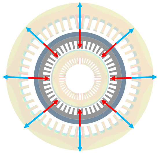 From Equation (7), it can be seen that the radial force during load is generated by three components: , the magnetic flux density generated by the permanent magnet field acting alone; , the magnetic flux density generated by the interaction between the permanent magnet field and the armature field; and , the magnetic flux density generated by the armature field acting alone. Expanding Equation (8), since the radial force generated by the interaction of the -th order modulation function has a smaller amplitude, such radial forces are neglected, and only the larger amplitude radial forces are retained, resulting in the following formula: