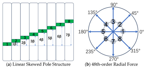 When , the 48th-order radial force generated by the motor will be deflected. If a linear segmented skewed pole structure is used, the deflection of the 48th-order radial force is shown in Figure 8. It can be seen that, when using the linear segmented skewed pole structure, the 48th-order radial forces generated by segments 1 and 5, 2 and 6, 3 and 7, and 4 and 8 cancel each other out in the circumferential direction. However, in the axial direction, for example, between segments 1 and 5, there exists an axial spacing of 3 rotor segments, which reduces the ideal cancelation effect of the 48th-order radial force.