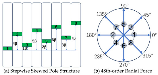 Illustration of stepwise skewed pole and 48th-order radial force deflection for each rotor segment.