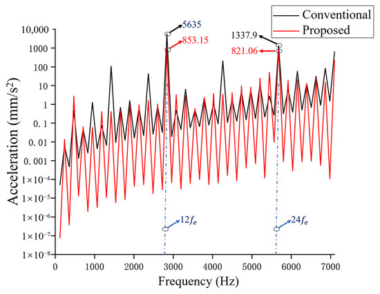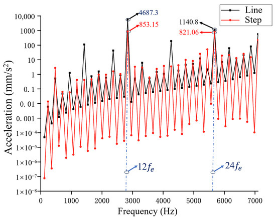 To validate the advantages of the stepwise skew configuration, a comparative simulation analysis was conducted to evaluate the vibration acceleration amplitudes on the motor surface between linear skew and stepwise skew designs. The simulation implementation of segmented skew differs slightly from conventional methods, where both linear and stepwise skew angles for each rotor segment were configured in Maxwell 2D Model Settings while the 3D stator model was equally divided into eight axial sections. Additionally, to ensure accurate acquisition of vibration acceleration results, the maximum frequency was set to 7100 Hz. The simulation results are presented in Figure 10, demonstrating the effectiveness of the stepwise skew design in vibration suppression while maintaining torque performance. The analysis shows that the vibration acceleration at the stator surface at the , caused by the 48th-order radial force, is 4687.3 mm/s2. However, after adopting the stepwise skewed pole structure, the vibration acceleration at the is reduced to 853.15 mm/s2, which further validates the significant optimization effect of the stepwise structure on the motor’s . Furthermore, significant reductions in vibration acceleration amplitudes were observed at the , , and , while the remaining harmonic components exhibited relatively minor magnitudes that did not warrant detailed comparative analysis.