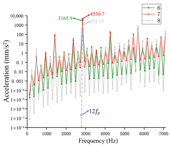 Additionally, the optimization performance of the stepwise skewed pole structure when the rotor is divided into 6, 7, and 8 segments was analyzed, as shown in Figure 11 and Figure 12. When the rotor is divided into an odd number of 7 segments, the radial force does not completely cancel in the circumferential direction, so the vibration acceleration at is higher than the result with 6 segments. However, when the rotor is divided into 8 segments, the cancelation effect of the 48th-order radial force is ideal, and the vibration acceleration at is minimized.