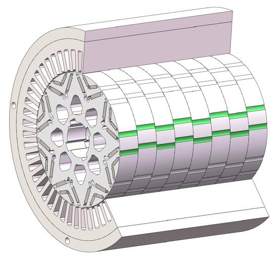- Hong, J.; Wang, S.; Sun, Y.; Sun, X.; Cao, H. Piecewise Stagger Poles with Continuous Skew Edge for Vibration Reduction in Surface-Mounted PM Synchronous Machines. IEEE Trans. Ind. Electron. 2021, 68, 8498–8506. [Google Scholar] [CrossRef]