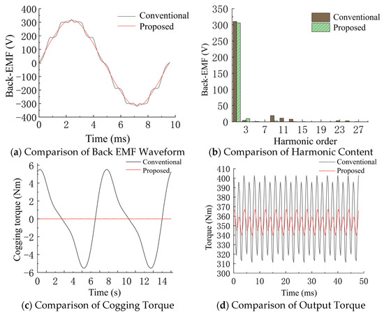 Additionally, after applying the stepwise segmented skewed pole structure, significant improvements were observed in the motor’s no-load back EMF harmonics, load torque fluctuations, and cogging torque, as shown in Figure 15.
