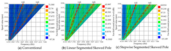 Finally, an air domain with a radius of 1 m is established centered on the motor, and the vibration results from the structural field are mapped to the acoustic field. The noise level caused by sound wave propagation is calculated through simulation. Figure 17 shows the noise waterfall diagram across the full speed range of the motor before optimization, after linear skewed pole optimization, and after stepwise skewed pole optimization.