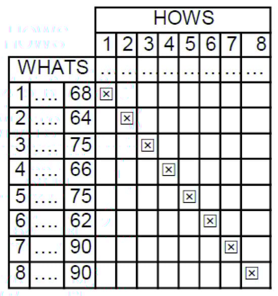 The purpose of distinguishing between various levels of correlation and weighting them is to be able to prioritise the HOWs [18]. The aim is to ensure that when moving from WHAT to HOW, i.e., from expectations to the corresponding substitute characteristics, the hierarchy of the WHATs is not overlooked. In this way, the priorities from the customer’s point of view and the company’s strategy will be respected.