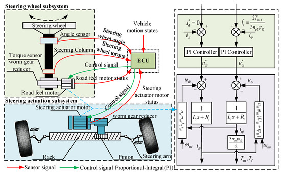 Working Principle of SBW System: The driver inputs steering commands by rotating the steering wheel. The Electronic Control Unit (ECU) then calculates the target steering angle by integrating the vehicle’s motion state and driver inputs via a predefined algorithm. Next, the steering angle tracking control algorithm determines the required torque for the steering actuator motor to achieve the desired motion, driving the motor to execute steering. Simultaneously, the ECU generates road feel feedback torque based on vehicle speed, road conditions, and real-time steering wheel status, simulating force feedback through a motor to provide the driver with realistic road feel for precise vehicle control [21,22,23].