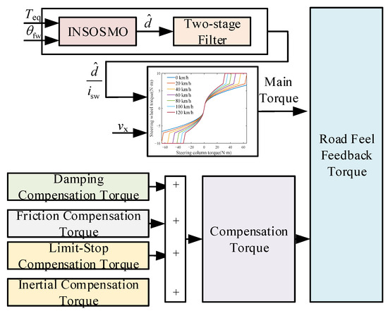 - A two-stage filter is proposed to eliminate extraneous components in road feel feedback torque: The filter combines STKF with a first-order low-pass filter to process the observed values from the INSOSMO. Based on the filtered results, the main road feel torque is designed, which is then superimposed with compensation torque to generate the final road feel feedback torque.