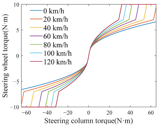 The performance evaluation of road feel feedback torque can be quantified based on the dynamic mapping relationship between lateral acceleration, steering wheel torque, and steering wheel angle. In high-speed driving conditions, where steering precision and stability are prioritized, the high-speed on-center handling test is typically employed to assess road feedback torque. Conversely, in low-speed driving conditions, where steering ease is the primary objective, the low-speed lemniscate test is commonly used for evaluation. Furthermore, to comprehensively validate the dynamic performance of the designed road feel feedback torque, the steering wheel torque filtering test and the steering angle limit test are incorporated alongside the high-speed on-center handling test and low-speed lemniscate test for more thorough verification. The parameters of the road feel torque are selected as follows: kine = 0.15 kg·m2; kfric = 0.65 N·m·s/deg; ρ1 = 60; kdam = 0.03 kg·m/deg; v0 = 30 km/h; klimit = 0.65 N·m/deg; and θlimit = 370 deg.