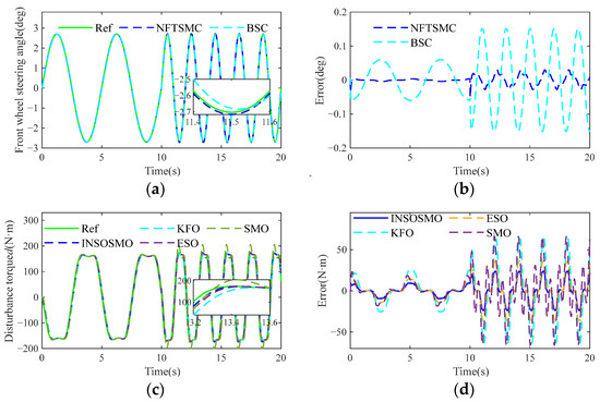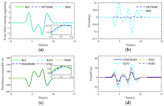 The DLC test is conducted to simulate vehicle lane-switching behavior. The analysis of Figure 9a,b demonstrates that NFTSMC maintains significantly higher tracking accuracy than BSC. During the lane-change maneuver, tracking errors progressively increase for both algorithms, with peak errors occurring at approximately 7.6 s—0.0088 deg for NFTSMC versus 0.1105 deg for BSC—coinciding with the transition back to straight-line driving. Figure 9c,d reveal that the system disturbance torque d observation error also peaks at this critical phase, confirming its substantial impact on control precision. Furthermore, Table 1 shows that the observation performance of INSOSMO is enhanced by 61.8%, 33.8%, and 43.1%, respectively.