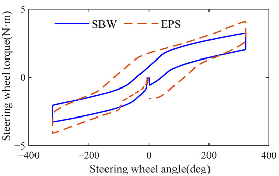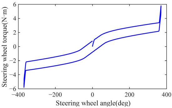 As analyzed in Figure 10, the work required by the driver to rotate the steering wheel during a low-speed lemniscate test is significantly less than that of the EPS system, while the average friction torque of the SBW system’s steering wheel is also smaller than that of the EPS system. Additionally, due to the presence of friction torque, when the steering wheel begins to rotate, the torque suddenly increases to 0.81 N·m. When the steering wheel angle is between 0 deg and 80 deg, the steering wheel torque gradient is relatively large. When the steering wheel rotation angle exceeds 80 deg, the steering wheel torque gradient starts to decrease. When the steering wheel angle reaches 321 deg, the steering wheel torque reaches its maximum value of 3.25 N·m. It can be seen that the designed road feel feedback torque can meet the lightness requirements under low-speed driving conditions.