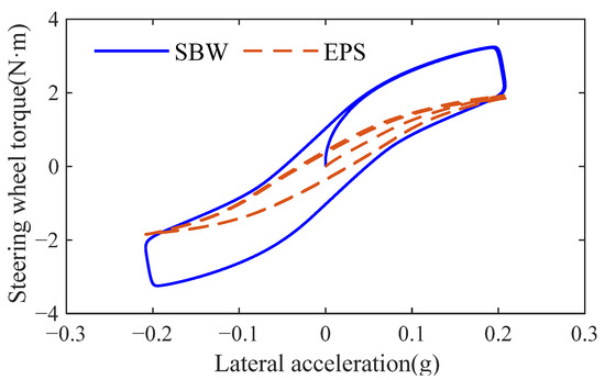 Based on the analysis of Figure 11, the steering wheel torque of the SBW system at 0 g lateral acceleration is significantly greater than that of the EPS system, indicating that it possesses stronger system dry friction characteristics that can effectively prevent unintended vehicle lateral motion caused by driver misoperation. The torque gradient of the SBW system at 0 g is significantly greater than that of the EPS system, demonstrating clearer road feel during straight-line driving conditions, which helps drivers better perceive the steering wheel’s center position through road feel variations. At 0.1 g lateral acceleration, the SBW system’s steering wheel torque gradient is significantly greater than the EPS system’s, with the SBW system’s maximum torque being 3.17 N·m compared to the EPS system’s 1.82 N·m. This indicates that during high-speed steering maneuvers, the designed road feel feedback torque is clearer and more stable, meeting the design requirements for road feel feedback torque.
