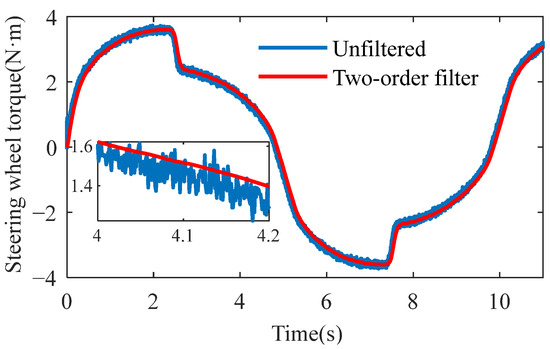 Steering wheel torque filtering test: To validate the effectiveness of the designed two-order filter, a sinusoidal steering wheel input with an amplitude of 40 deg and a frequency of 0.1 Hz is applied at a constant vehicle speed of 60 km/h. The observed system disturbance torque is then processed through the filter. The simulation results are presented in Figure 12.