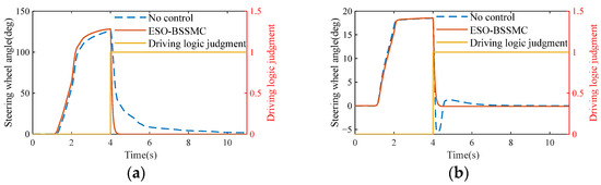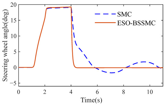 In order to verify the effectiveness of the designed steering wheel active return controller, the vehicle speed is set to 30 km/h and to 80 km/h, the driver inputs a constant torque to the steering wheel, and then the driver releases the steering wheel after 4 s to obtain the change curve of the steering wheel angle over time under the steering wheel active return controller designed. The simulation results are shown in Figure 14. The parameters of the ESO-BSSMO are selected as follows: Jeq1 = 4.30026 kg·m2; Beq1 = 2.3169 N·m·s/rad; l1 = 599.9462; l2 = 119,970; l3 = −312,000; k3 = 2; c1 = 70; λ1 = 15; and h = 25.