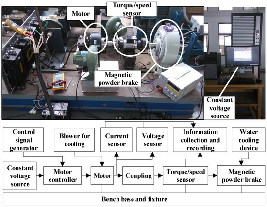 According to the nameplate parameters of the motor, the mass of the motor is 18.6 kg; the rated power of the motor is 3 Kw; the peak torque of the motor is 150 Nm; and the peak speed of the motor is 750 r/min. In order to obtain the driving data required for the identification of the permanent magnet DC brushless motor model, as shown in Figure 1, a bench characteristic test of the motor was conducted, and multiple sets of data were classified and collected. As shown in the figure, the motor, speed, torque sensor, and magnetic powder brake are fixed on the base with fixtures to ensure consistent horizontal height. The three are connected with coupling to meet their coaxial requirements. A constant voltage source is used to provide stable input voltage for motor characteristic testing, and magnetic powder brakes are used to apply simulated loads. In addition, in order to minimize the disturbance of temperature rise on the test data of motor characteristics, a high-power blower is used to cool the motor, and a flow water cooling device is used to cool the magnetic powder brake.