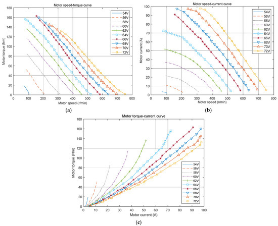 Motor characteristic data under different line voltages: (a) motor speed torque curve, (b) motor speed current curve, and (c) motor torque current curve.